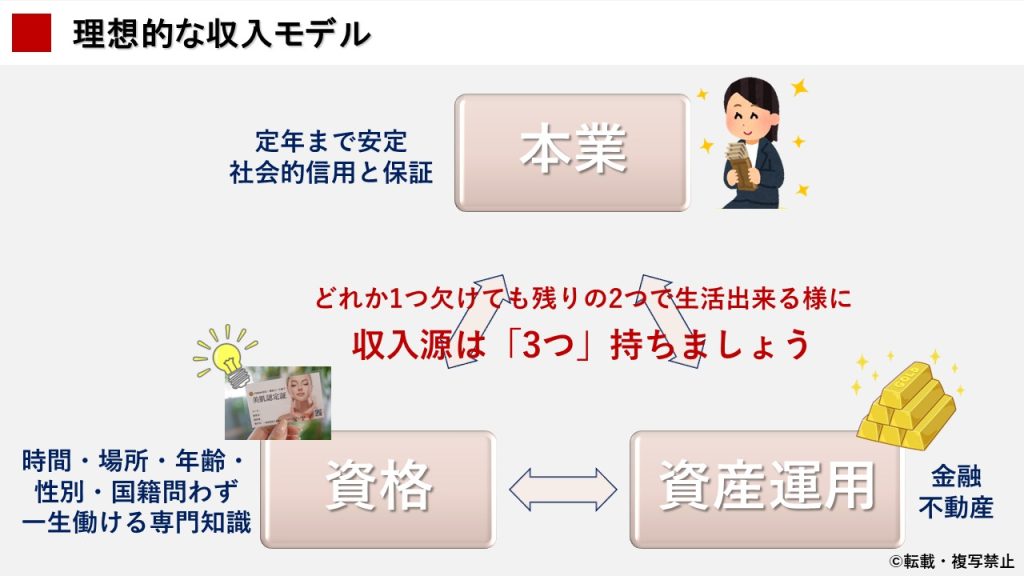 結婚すれば収入が「配偶者・自分・資産運用」となりますが、離婚や未婚の場合は自力で「3つの収入源」を確保しなければなりません。